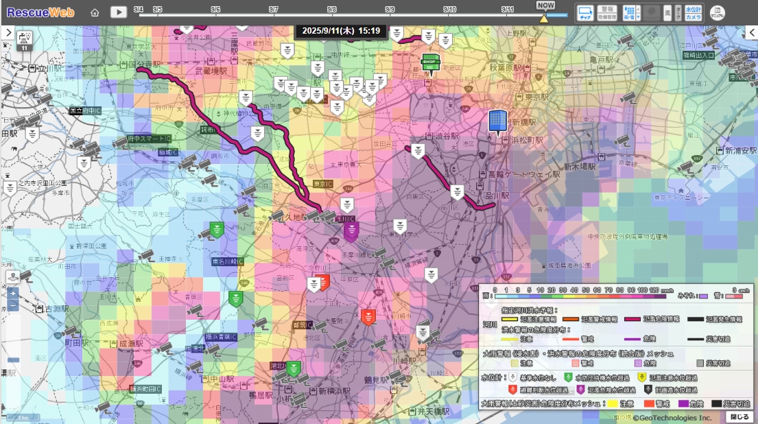 2025年9月11日15時20分頃の東京23区南部から川崎市周辺の雨雲や河川の状況