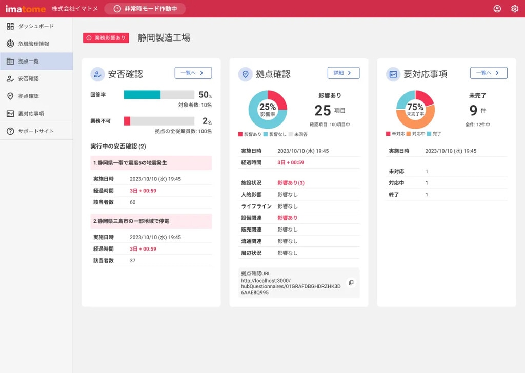 また、拠点ごとの安否や業務影響、要対応事項についても拠点別のダッシュボードで確認することができます。