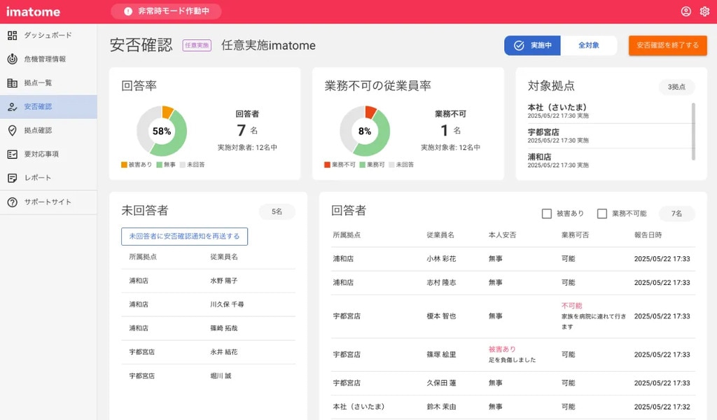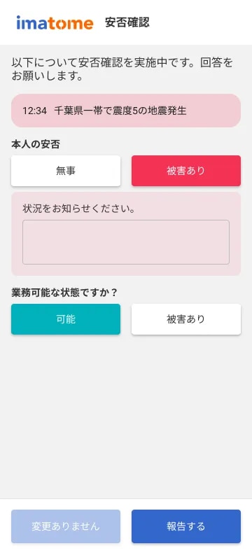 imatomeでは災害が発生した際に従業員の安否状況と業務可否をすばやく確認し、
