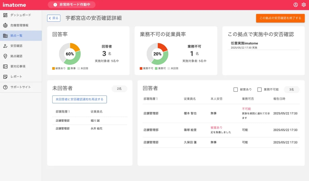 ▼拠点ごとの安否確認詳細画面イメージ