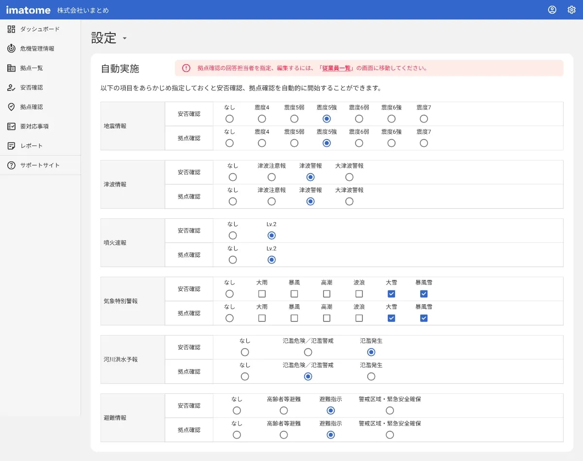 地震や津波、火山、気象特別警報、避難情報などをそれぞれ自動的に安否確認を行いたい基準を設定することが可能です。