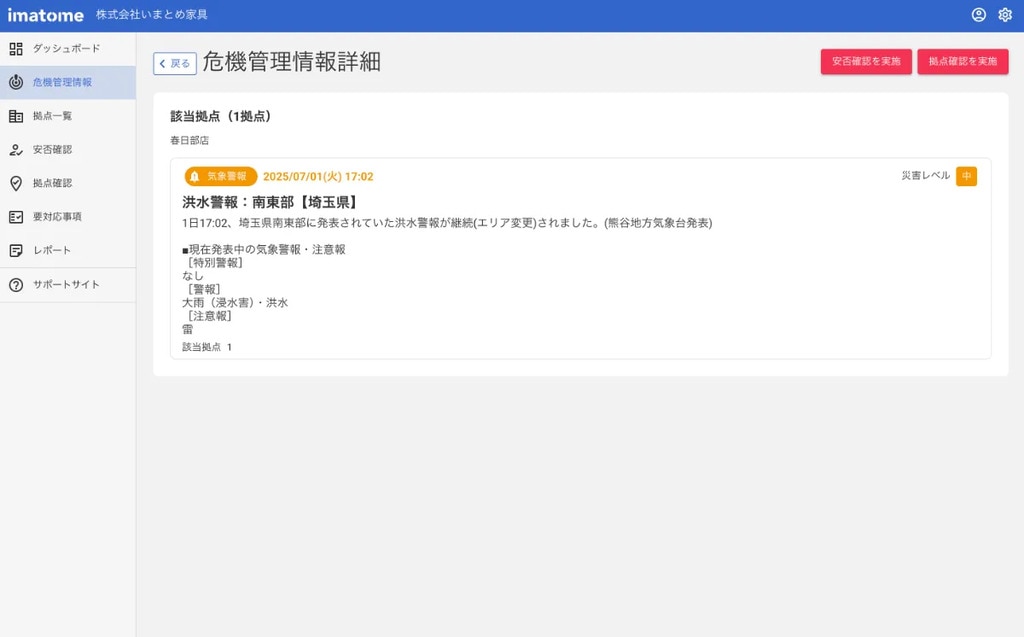 危機管理情報を元に該当の従業員や拠点に対して安否確認や拠点状況確認を行うことも可能です。