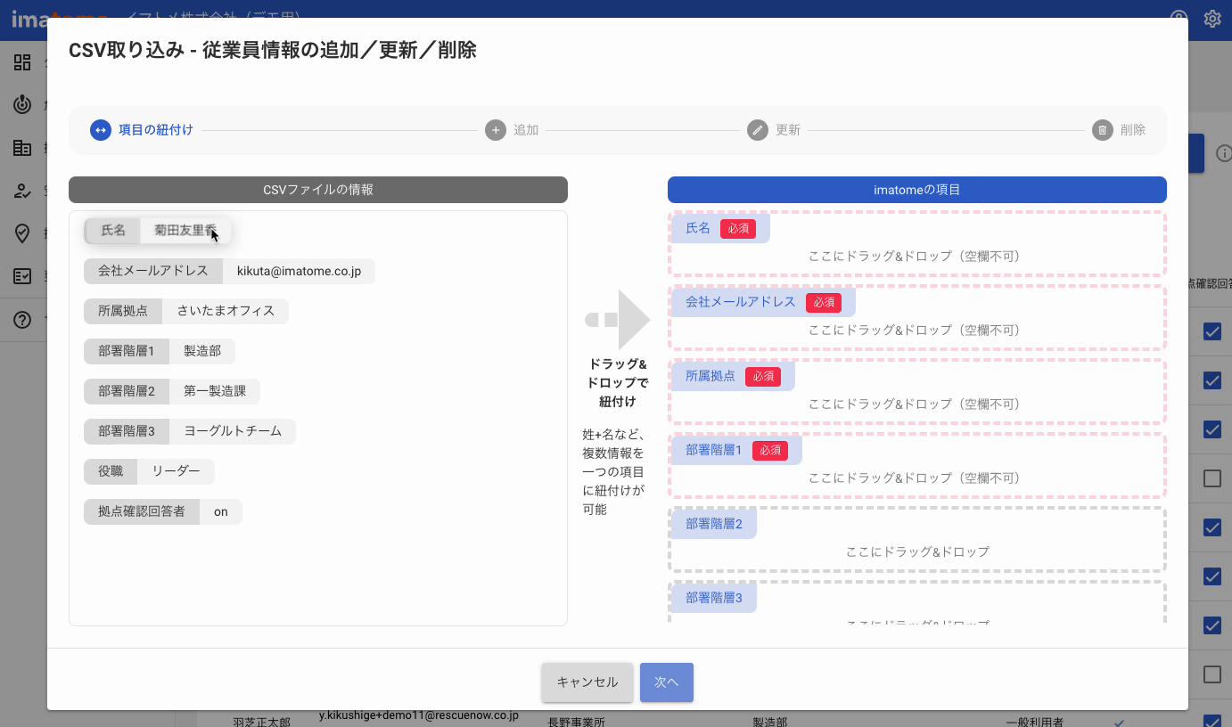 必要項目が含まれた従業員情報のCSVがあれば、どのようなフォーマットでもimatomeにそのまま取り込みすることができます。