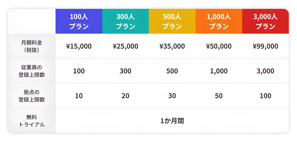 登録できる従業員数や拠点数により複数のプランを用意しています。
