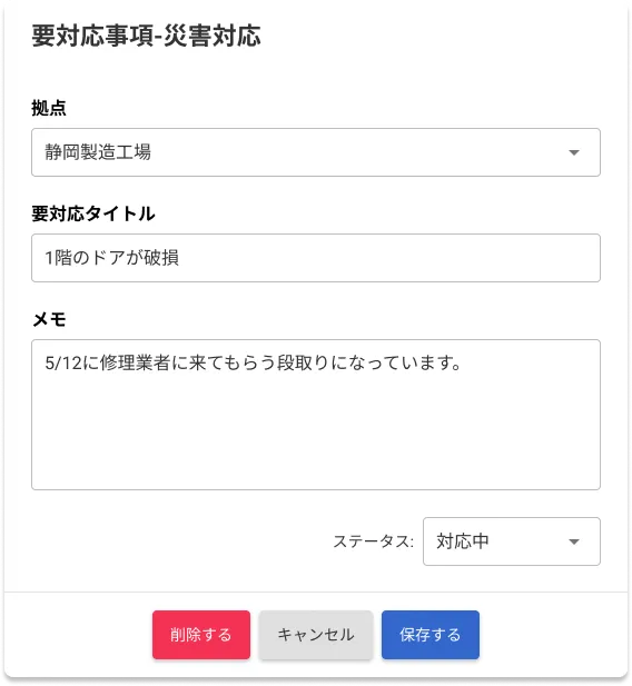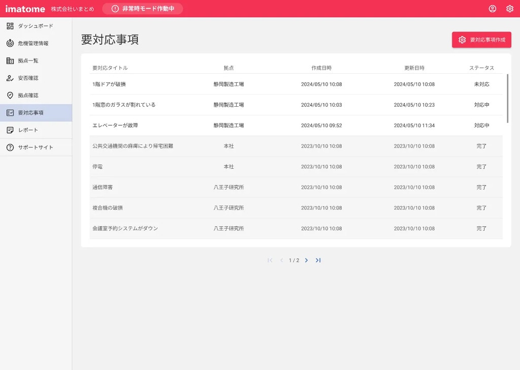 対応が必要な事項をimatomeに登録し、危機発生時のタスクを見える化します。「未対応」「対応中」「完了」の3つのステータスで管理することができます。